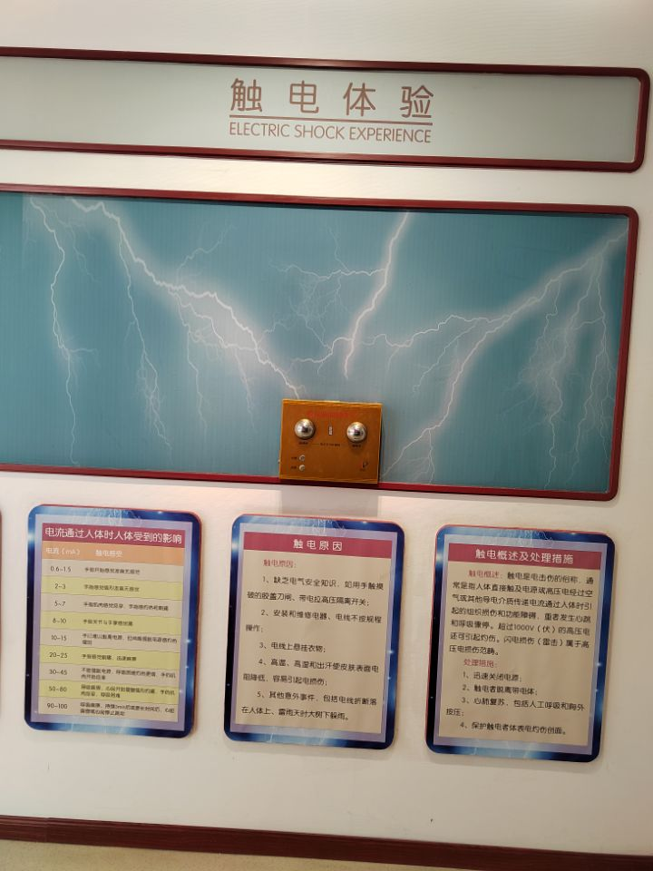 通过体验人体对不同程度电流的反应,使体验者了解到触电的危险性,让体验者增强安全用电意识。并放置电力相关事故案例。