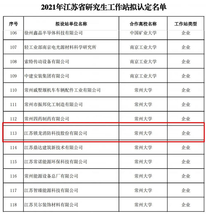 由省教育厅委托省高校科技发展中心组织专家,对2021年江苏省研究生工作站和江苏省优秀研究生工作站示范基地申报单位进行评审,江苏锁龙消防科技股份有限公司与常州大学联合申报的“2021年研究生工作站”获得审批通过。